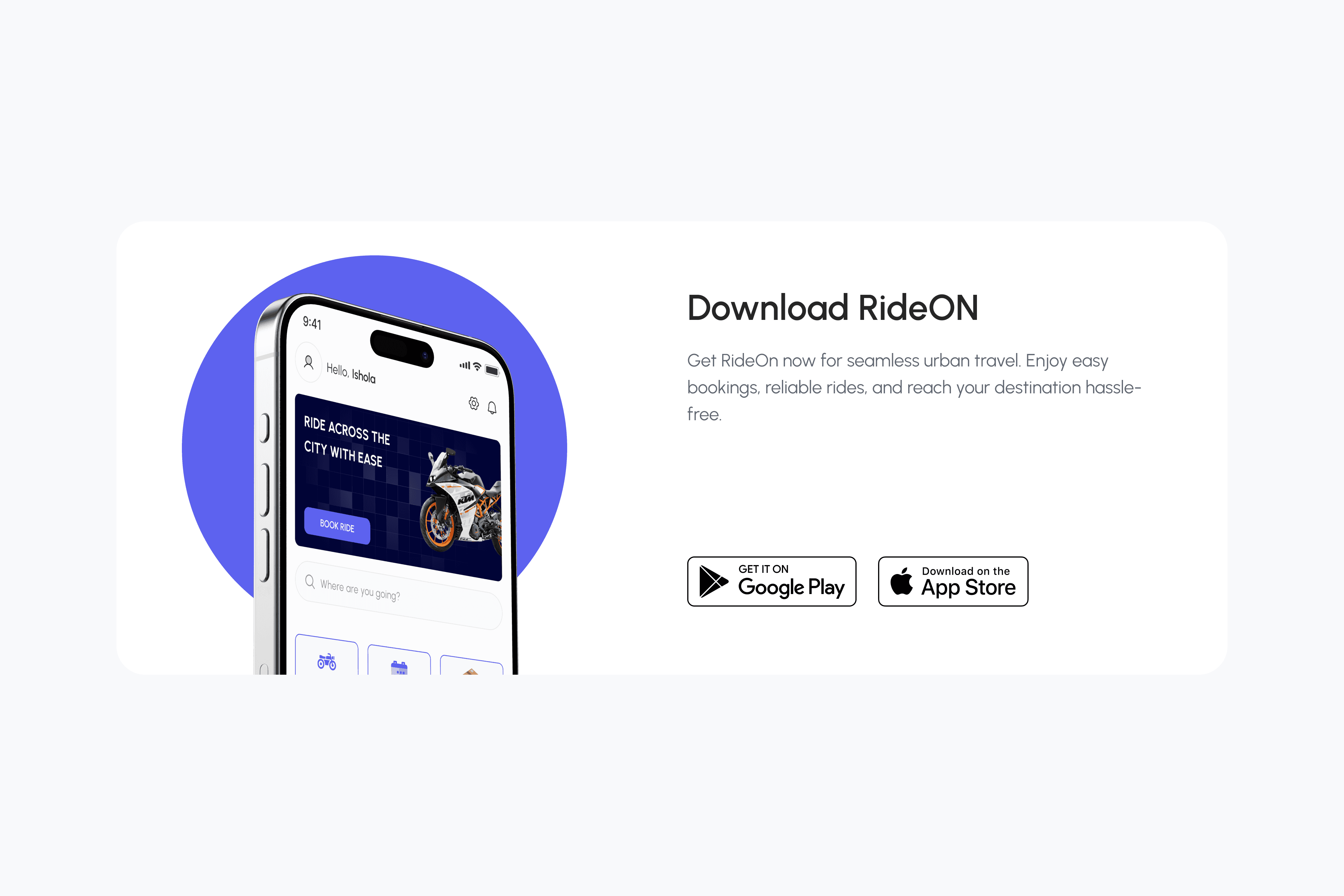 RideON is a new motorcycle-based ride-hailing and delivery service launching in Nigeria. The goal was to build a mobile platform that allows users to quickly book motorcycle rides, schedule future trips, and send packages across town with ease.