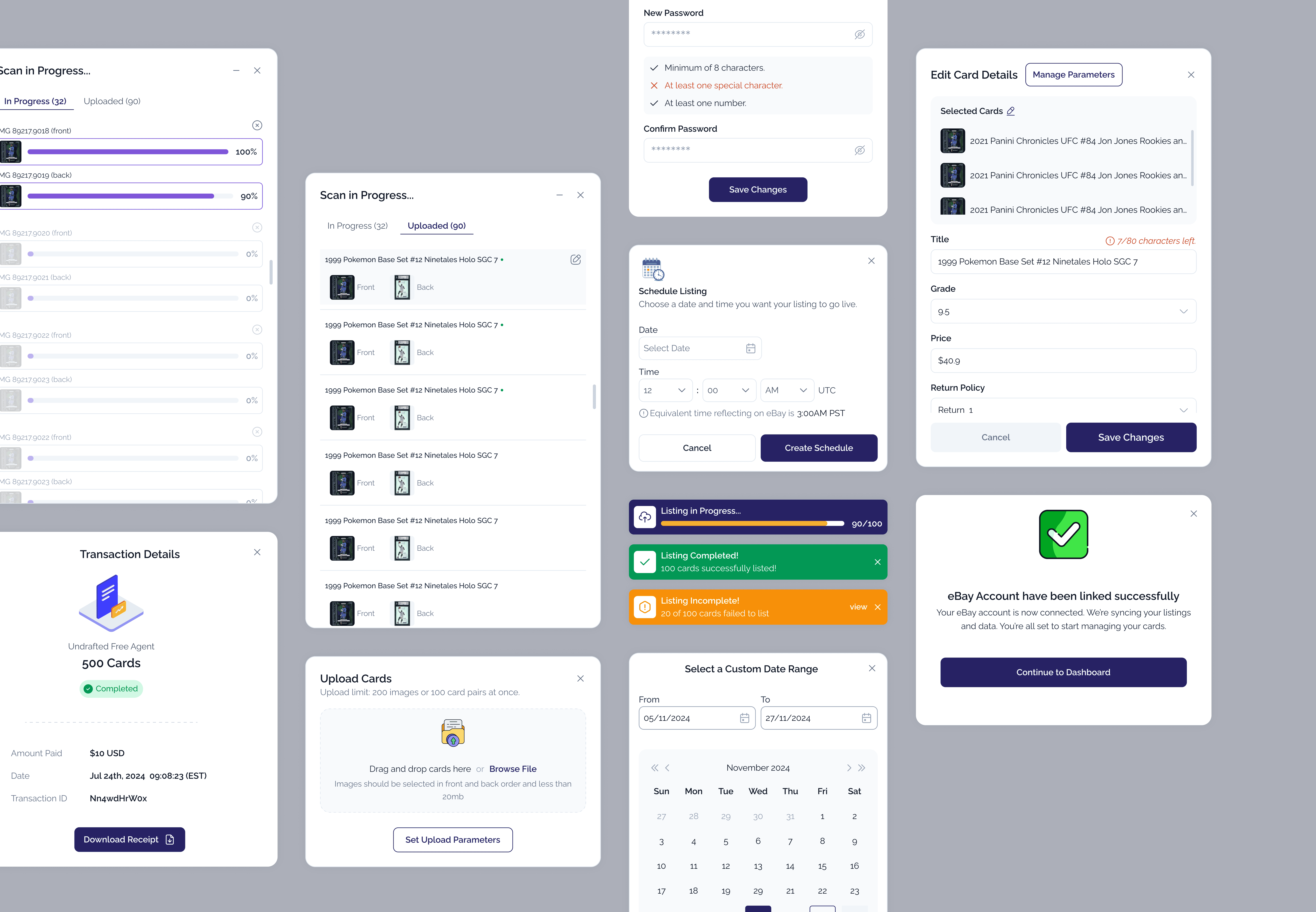 Listing History & Management: I designed a full-featured listing history system that includes scheduled listings, failed listings, and unlisted cards—giving users control over their entire listing lifecycle.